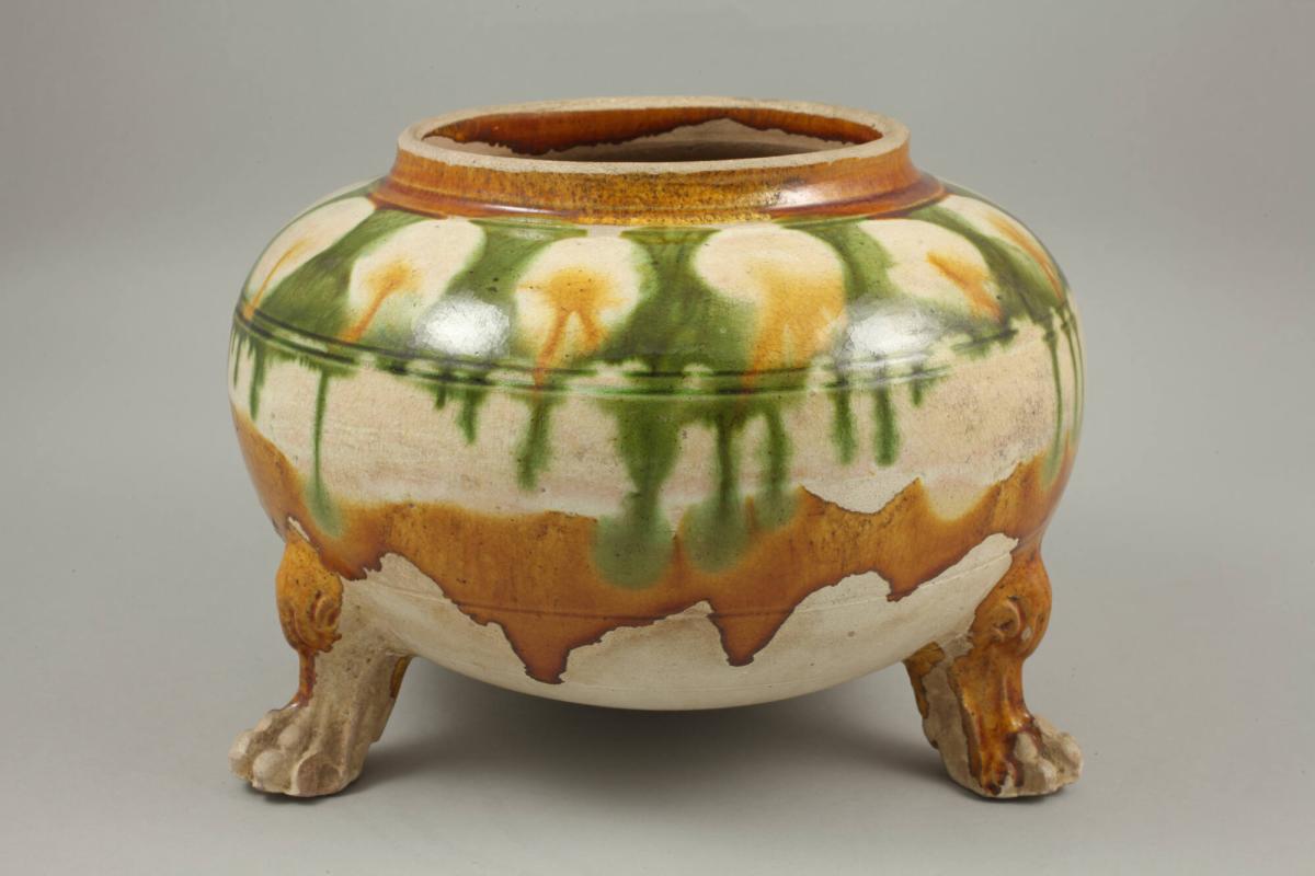Not on viewThis is an example of one of the earliest polychrome effects created with a glaze. Closely associated with the Tang dynasty (618-907), the “three-color” (sāncǎi 三彩) glaze is characterized by bold colors and an unpredictable flow. Using lead oxide (PbO) as a flux in the glaze created a lower melting point, and the colors came from the addition of copper oxide (CuO, Cupric Oxide) for green and iron oxide (FeO, Ferrous Oxide) for browns and yellows, set off by the white of the clay body. Random glaze movement arose from drifting wood ash in the kiln, which fell unpredictably and reacted with the glaze. On this incense burner, a technique of covering areas with wax before glazing called wax resist was used to create the patterns of circles around the vessel’s shoulders. The simple, functional shape of this incense burner is energized by sculptural animal paws for legs and the lively colors and pattern of the glaze.