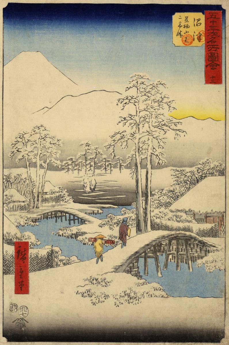 Mt. Fuji and Mt. Ashigara from Numazu in Clear Weather after a Snowfall, no. 13 from the series Pictures of Famous Places of the Fifty-three Stations, the Vertical Tōkaidō
