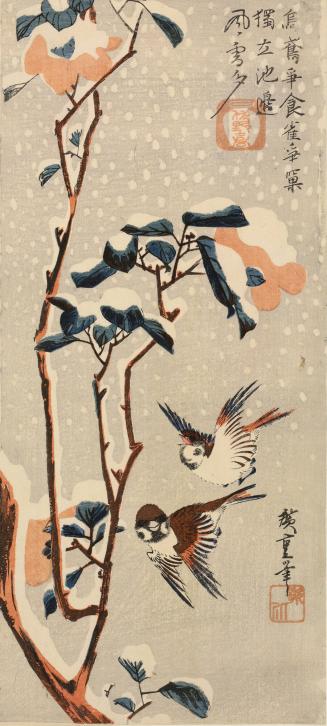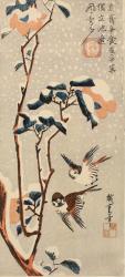Sparrows and Winter-flowering Camellia in Snow