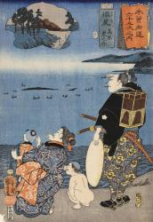 Not on viewShiojiri is one of the sixty-nine stations of the Kisokaidō road. Kuniyoshi’s imagination connects the land-locked town with the ocean through the sound of the place-name, crafting an elaborate linguistic-visual pun. The first part of the place-name, Shiojiri, sounds like “salt” or “seawater” (shio). The second part, “jiri,” refers to shiri, meaning “bottom,” and is translated visually into the squatting naked boy in the bottom-center.