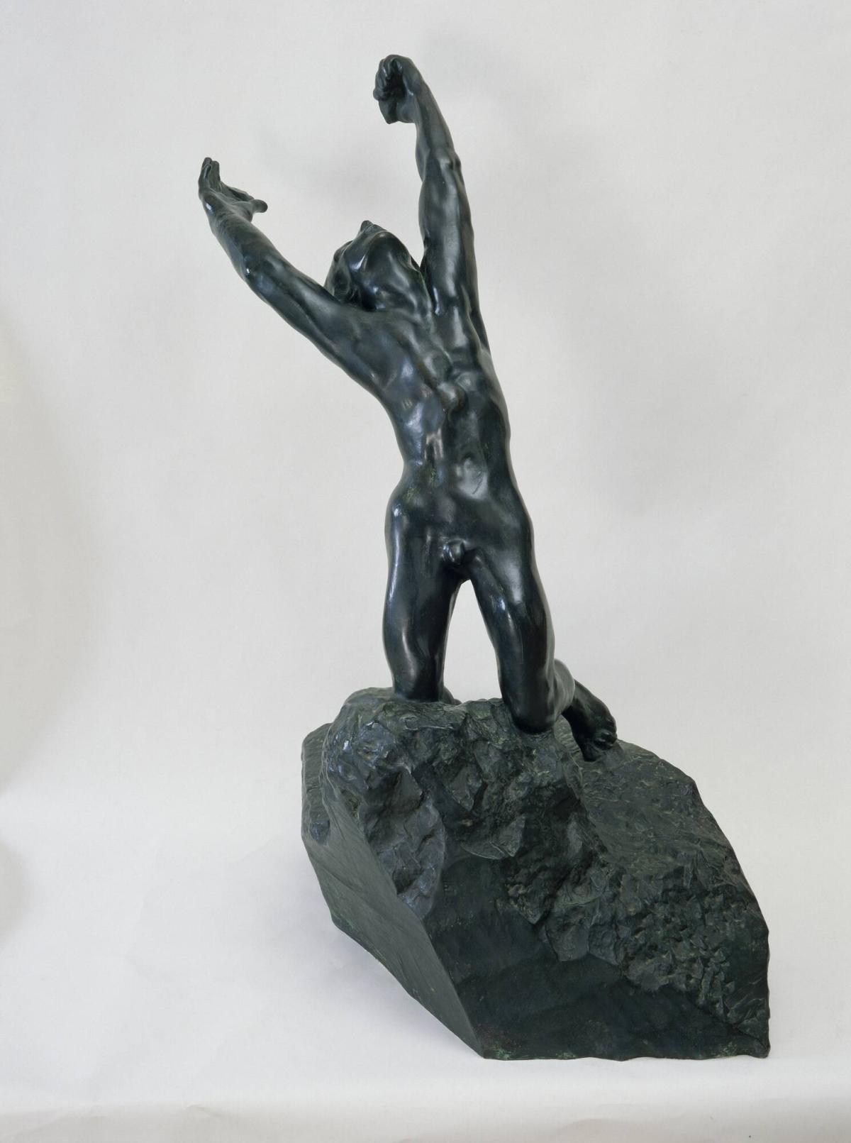 This powerfully emotional work displays the vulnerability of its protagonist, a young man who kneels on a massive rock, torso uncomfortably angled, head thrown back and arms outstretched. His face, with open mouth, is similar to that in numerous other works by the artist that express sorrow, longing, or fear. The prodigal son, from a biblical parable, leaves his family and returns destitute, pleading for mercy and forgiveness. His despair, energy, and pentup feelings are fully expressed in Rodin's work.