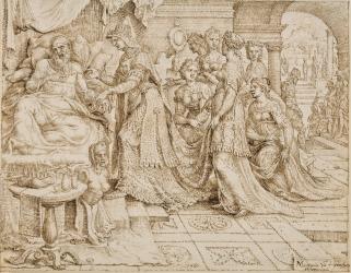 Not on viewThe drawing depicts the scene from I Kings 21:4-7 in which, having been refused the opportunity to purchase a vineyard, Ahab has taken to his bed and is comforted by his wife, Queen Jezebel, who secretly plans to kill Naboth, the vineyard's owner. The drawing is the first in a series of six made in 1561 for a set of prints illustrating the story of Jezebel's treachery. It is a tour-de-force that repays detailed examination, from the king's crown and scepter on the table to the brilliantly shining sun over the distant landscape.
