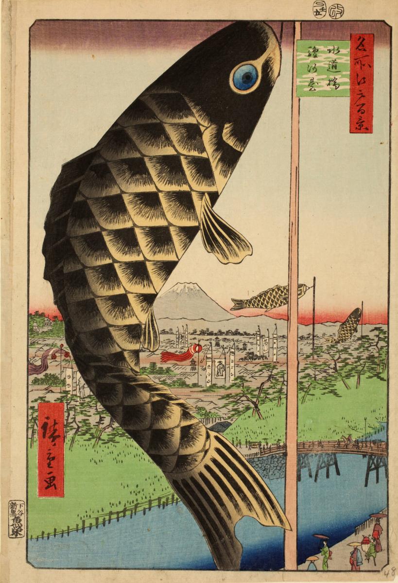 Not on viewNo. 48 (summer section) on the title page for the series. In this series of prints produced at the end of his career, Hiroshige, the renowned pioneer of landscape art in the ukiyo-e genre, explores relations between the natural world and human activity in and around Edo (modern Tokyo). Here we see koinobori, the carp-shaped wind socks typically flown to celebrate Tango no sekku, a traditional event now celebrated on May 5th as the national holiday Children’s Day. Taking up a large part of the foreground, the nearest koinobori in this print boldly dominates the view of Edo, rising above Mount Fuji in the distance. Two others fly in the middle ground. Such wind socks are made by drawing carp patterns on paper, cloth, or other fabric. Landscapes across Japan are filled with koinobori from April to early May in the hope that children (traditionally young boys) will grow up healthy, strong, and successful. The carp is a symbol frequently associated with masculinity in East Asian art, serving as a metaphor for the dragon, a source of energy and strength.