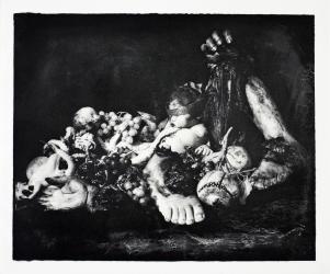 Not on viewThe surgical precision of Witkin’s work brings to mind the practice of dissection. The decomposed nature of the objects—which include amputated human hands and the autopsied corpse of an infant—recalls the photogravure technique the artist used to chemically carve the image into a printable plate. The compilation of such food items as octopus, grapes, and pomegranate references 17th-century Dutch still life, but with the inclusion of body parts Witkin deviates irreverently from the genre’s traditional focus on the sensuousness of ordinary objects. Does Witkin’s staged arrangement reduce human remains to the status of curiosities, or suggest profound connections between all forms of life? The work’s title, Feast of Fools, perhaps offers a clue. The feast of fools was a medieval Catholic ritual in which a low-ranking member of the clergy was elevated to the role of “Pope for a day” in a ceremony alternately considered reverential and blasphemous. Witkin’s work, too, captures the tension between homage and parody, between sacred and grotesque.