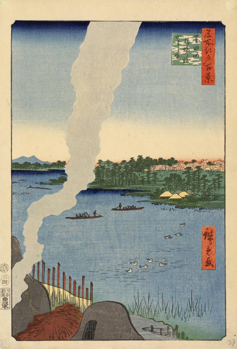 Tile Kilns by the Hashiba Ferry on the Sumida River (Sumidagawa Hashiba no watashi kawaragama), from the series One Hundred Famous Views of Edo (Meisho Edo hyakkei)