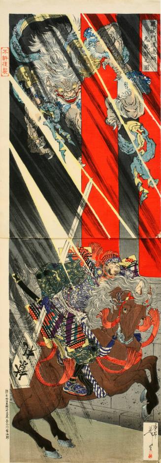Not on viewWatanabe no Tsuna 渡邊綱 (953–1025) was a historical warrior who became associated in many legends with fighting monsters and demons. His most famous battle was with Ibaraki Dōji 茨木童子, a demon who hid in the main gate of Kyoto, the Rashomon, and attacked anyone passing through. Watanabe challenges the demon, and defeats him by severing his arm, which he keeps as a trophy. A few days later, a woman claiming to be Watanabe’s aunt comes to visit, and asks to hear the tale and to see the demon’s arm. When the warrior shows her the arm, she grabs it and escapes, revealing herself to be the demon in disguise. Yoshitoshi’s teacher, Kuniyoshi, did a number of prints of this same subject.