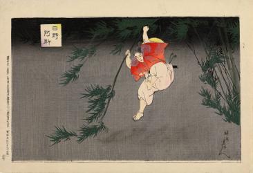 Not on viewA young warrior grasps a stalk of bamboo, which bends in an arc to slow his fall. This illustrates a moment in the legend of a 14th-century hero, Hino Kumawaka 日野熊若, or Hino Ashin 日野阿新. He was the son of a high counselor to Emperor Go-Daigo (1288–1339) and in some stories is linked romantically with the emperor. When Kumawaka’s father is unjustly accused, exiled, and executed, he vows revenge. After killing the man who executed his father, Hino is pursued by the man’s forces but escapes by swinging over a moat on a long bamboo stalk, seen here. As in the story of Mèng Zōng, seen in a nearby print, Kumawaka’s actions were often linked with the virtue of filial piety, or respect for one’s parents.