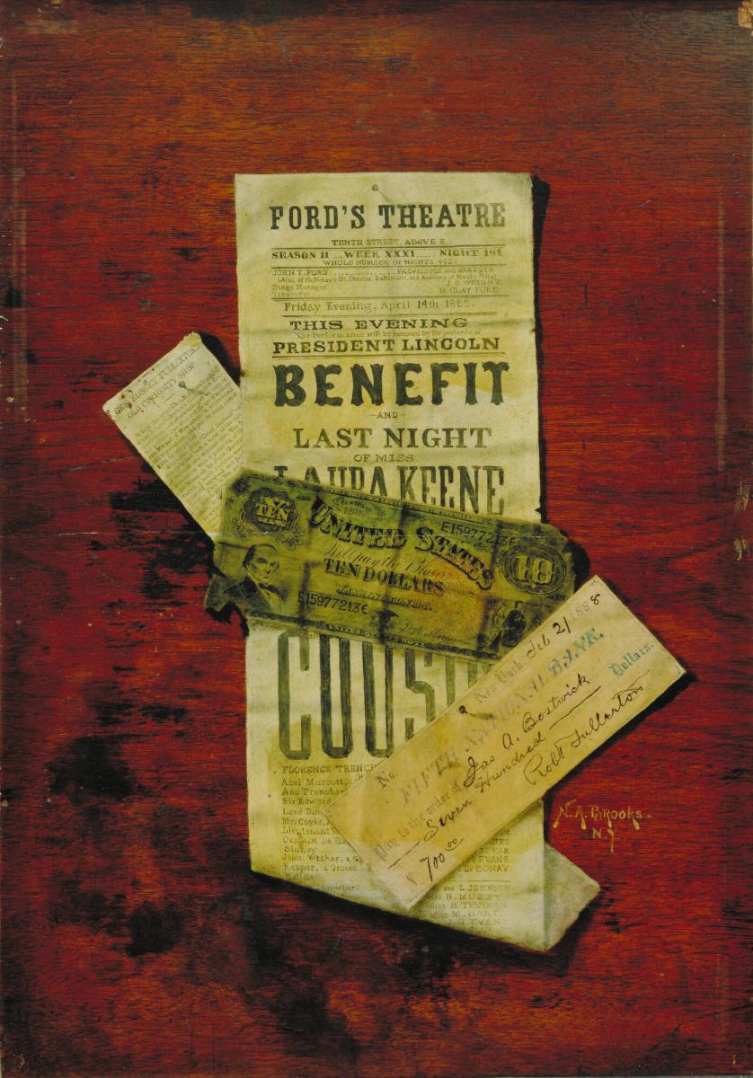 Not on viewThis still life is executed in the trompe l’oeil painting style popular at the end the 19th century, whose intent was to “trick the eye” through detailed realism. The arrangement depicts the handbill of the play presented at Ford’s Theatre on the night of President Lincoln’s assassination, a ten-dollar bill, a newspaper clipping, and a check for seven-hundred dollars.
