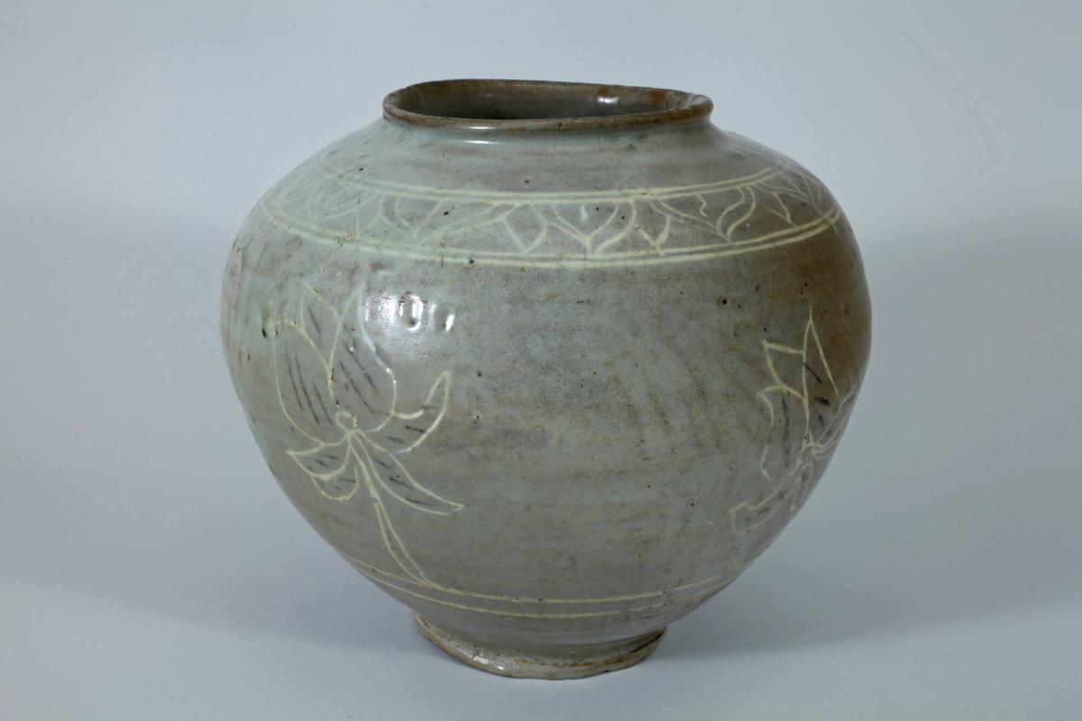 Celadon Burial Jar with Incised Decoration of Lotus Blossoms and Petals