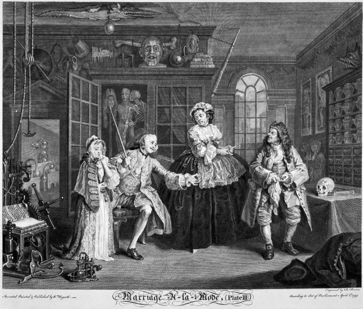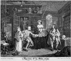 Marriage A-la-Mode chronicles the union of the bankrupt Earl Squanderfield's son and a wealthy merchant's daughter, an arrangement intended to elevate the former's financial situation and the latter's social standing. The lawyer Silvertongue quickly beguiles the young wife into an affair while her husband frequents prostitutes, from whom he has already contracted syphilis in the first scene. Overindulging in frivolous pastimes and expensive luxuries, the couple's household and relationship falls into disarray. Upon finding his wife with Silvertongue the husband is fatally wounded by the lawyer, who later hangs for murder. Distraught, the wife commits suicide, leaving her crippled child motherless.