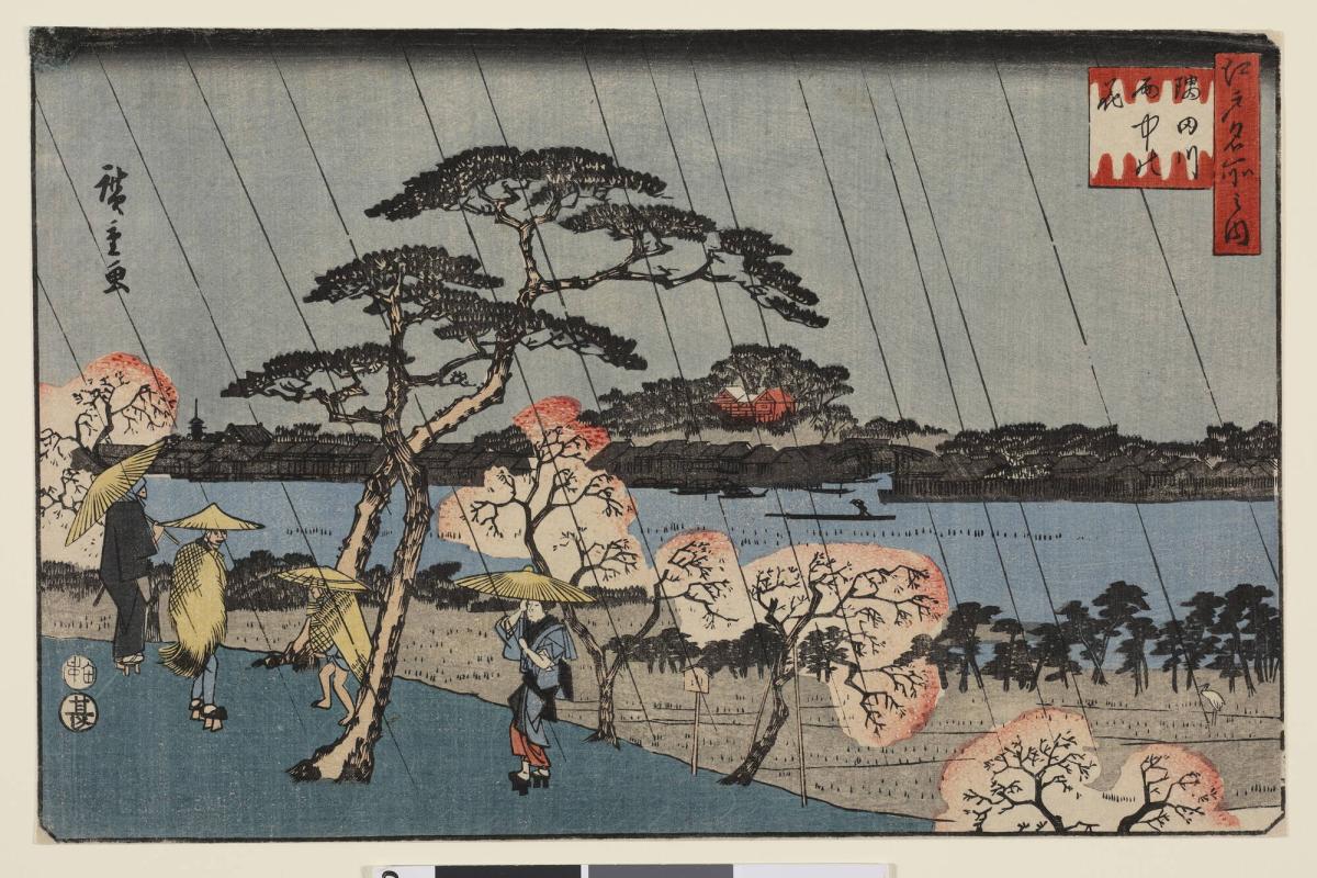 Cherry Trees in the Rain beside the Sumida River, from the series Famous Places in Edo