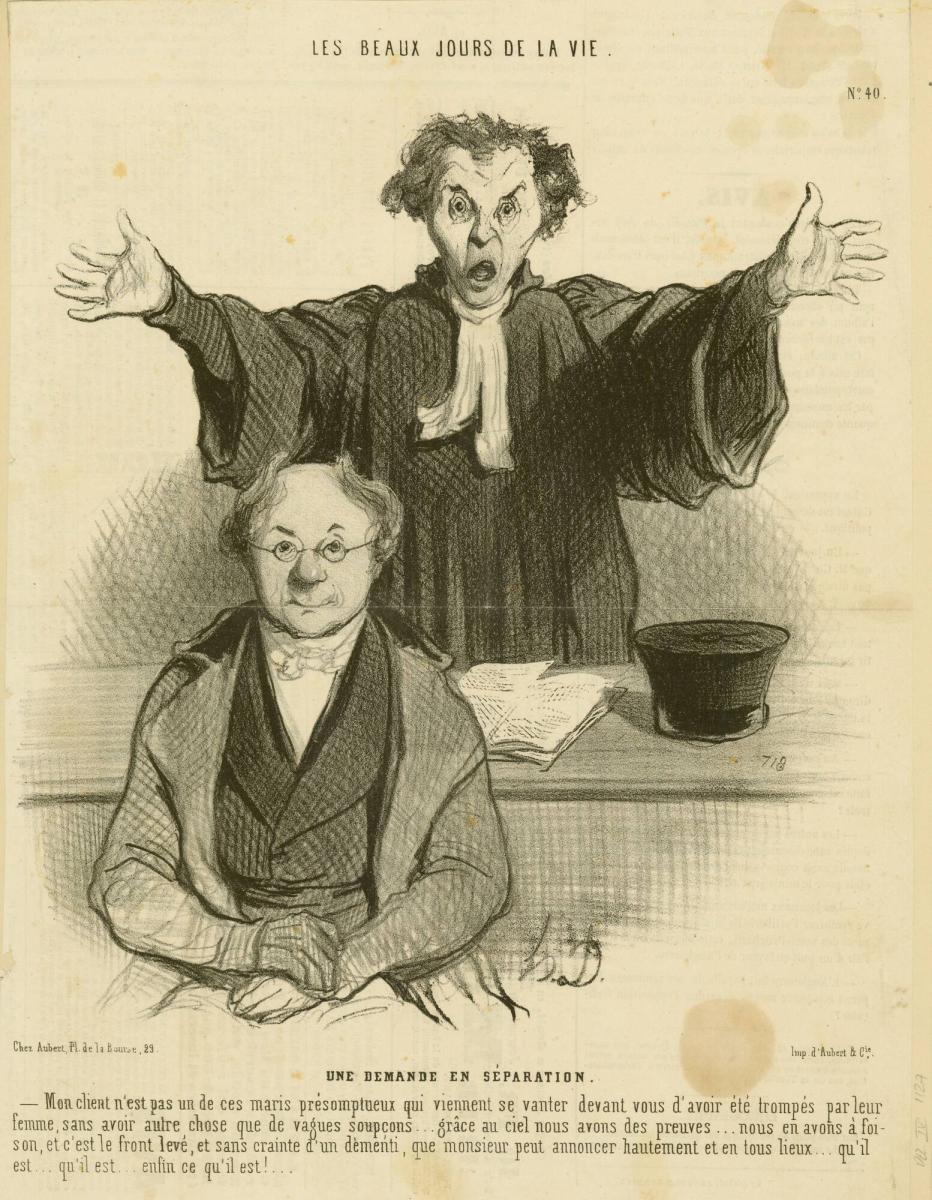 > —My client is not one of those presumptuous husbands who appears before you in order to boast that he has been deceived by his wife and has only vague suspicions for saying so...Thank God, we have proof... ample proof, and it’s with his head held high, and without fear of refutation, that this gentleman can announce openly and publicly... that he is... that he is...well, that he is what he is...<