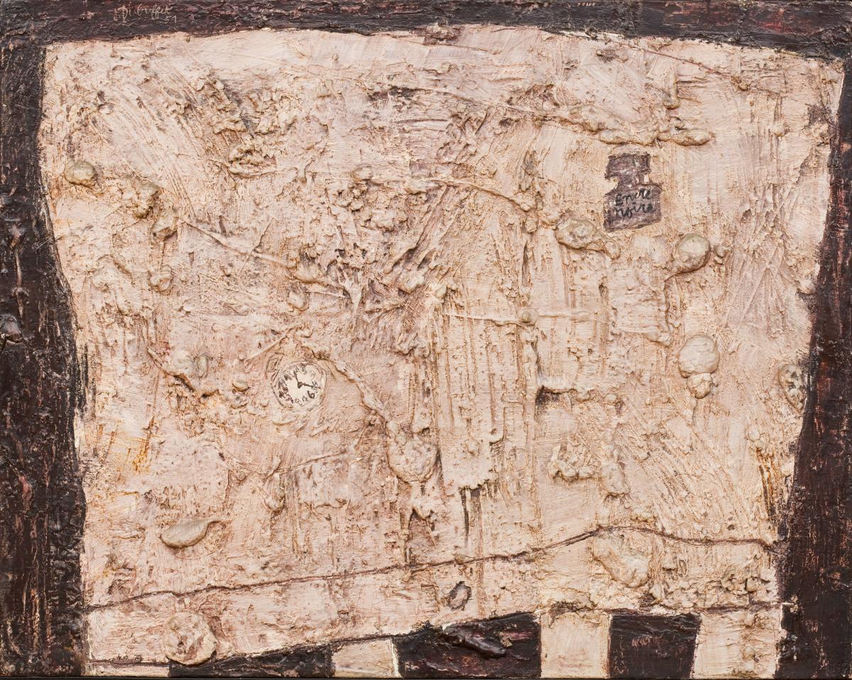 Not on viewJean Dubuffet was a significant force in postwar art, and perhaps one of the most “anti-artistic” in his disregard for conventional media and imagery, especially the human form. Crucial to his creative output was the separation of man and nature, and an opposition to classic, humanist culture, with many of his reference points overlapping with the goals of Abstract Expressionist painters. One of those was Jackson Pollock, who he met the year this work was made, on his first visit to the United States. The title of this painting translates as “Table with Watch and Ink Bottle.”