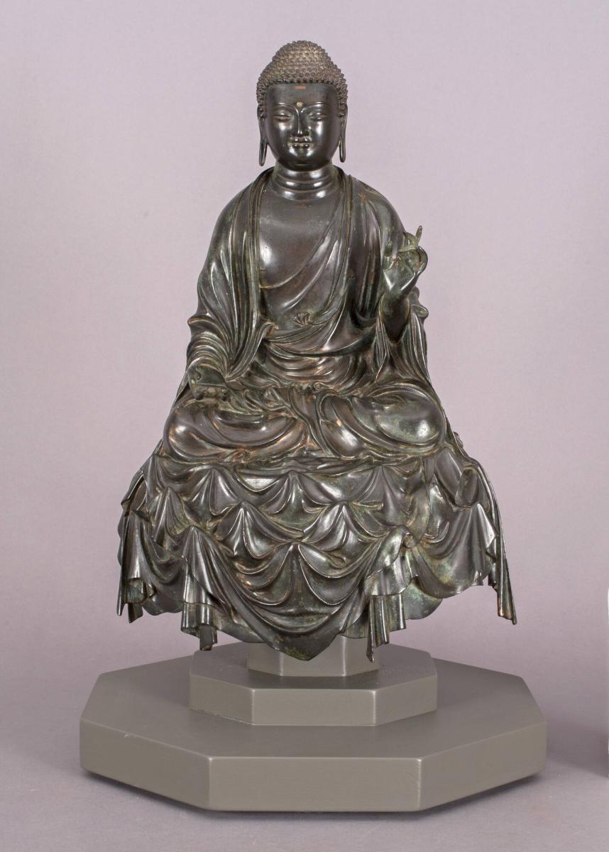 On viewThe Medicine Master Buddha (Yàoshīfó 藥師佛) is an important healing deity in East Asia. This work was originally gilded but probably lost its gold coating in a fire. It may have been enshrined in a monastery or the home of a wealthy family, perhaps part of a trio of buddhas. Identification as the Medicine Master Buddha is speculative but based on a standard representation in which one hand rests on the lap and holds a small jar of medicine. Look at the proper right hand—the tips of the middle fingers are broken, and the breakage pattern suggests that the fingers supported something, perhaps the medicine jar. Furthermore, this buddha often held aloft the seed of the myrobalan fruit (Terminalia chebula), respected as a healing plant. The raised left hand seems to once have grasped something, possibly a lost seed.
