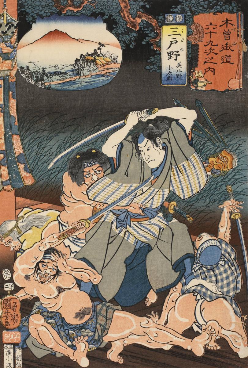 Midono: Mitono Kotaro Defending Himself from Ruffians at a Deserted Temple, no. 42 from the series The Sixty-nine Stations of the Kisokaidō