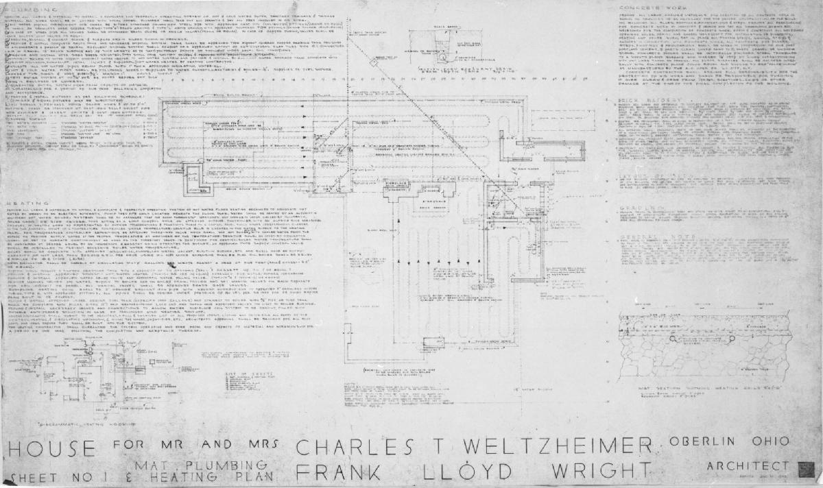 Sheet No. 1: Mat, Plumbing & Heating Plan, for The Charles Weltzheimer House, Oberlin, Ohio