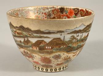 Sake Cup with Floral Brocade Interior Design and Exterior Views of Lake Biwa