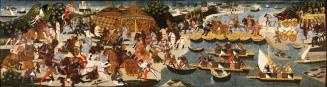 On viewThis painting-a representation of Xerxes' invasion of Greece in the early fifth century BC-was made as the front panel of a cassone, or low chest. It is the first such cassone panel to be firmly connected to the workshop of the artist Apollonio di Giovanni, who had the most successful shop for such works in fifteenth-century Florence. The coats-of-arms depicted on the painting are those of the wealthy and important Vettori and Rucellai families, and, as a marriage between those families occurred in 1463, the work can be securely dated to that time. Additionally, the account books for the shop confirm that the cassone was made for that marriage, and give the price as fifty florins, making this panel an exceptionally well-documented piece.