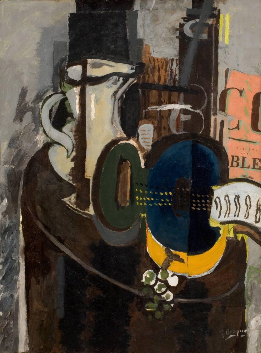 This still life of a guitar on a table, accompanied by a pitcher and bunch of grapes, was exhibited in the Salon d'Automne exhibition in Paris shortly after it was painted. It was singled out for praise in London's Sunday Times in 1960 by art critic John Russell, writing about works in US college and university museums that had no parallel for quality in their counterpart museums in England. The painting displays the dark tonality that characterized Braque's works made during the German occupation of Paris during the Second World War, with small passages of brighter yellow and peach colors. The layered and textured surfaces are typical of the artist's work at this time.