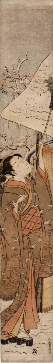 Not on viewA young lady sweeps the accumulated snow from the roof of a wooden gate. She wears a kimono with a beautiful pattern of cranes and pines, a symbol of longevity.