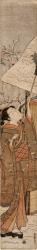 A similar composition by the artist Harunobu is known to be an illustration of the nō play Hachinoki, and this one may be as well. The play is set in the 13th century: a monk caught in a huge snowstorm stays overnight at the home of an impoverished couple, where he receives kind consideration and hospitality. The couple even use their treasured potted trees for kindling to light a fire for the monk. Later in the play it is revealed that the host was none other than Sano Genzaemon Tsuneyo, a samurai warrior and former lord, and the monk is Hōjō Tokiyori, the regent of Kamakura, traveling in disguise.