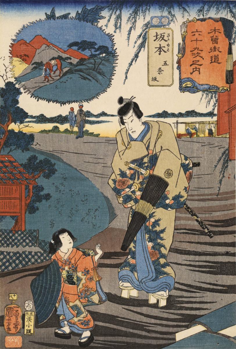 Sakamoto: Child Leading a Samurai at Gojozaka, no. 18 from the series The Sixty-nine Stations of the Kisokaidō