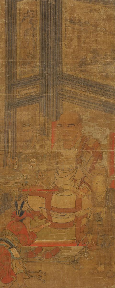 Not on viewThe oldest Chinese painting in the AMAM collection, this important work represents an arhat, an enlightened Buddhist sage known in Chinese as a luóhàn 罗汉 / 羅漢. Although often portrayed as eccentric ascetics, another mode of representation, seen here, shows an arhat as an urbane, high-ranking monk. The arhat sits in a chair with his legs crossed under his robe, his sandals on the footrest in front of him and a decorative screen behind. He grasps a fly whisk, a symbol of rank, and his elevated status is reinforced by the attendants who serve him.