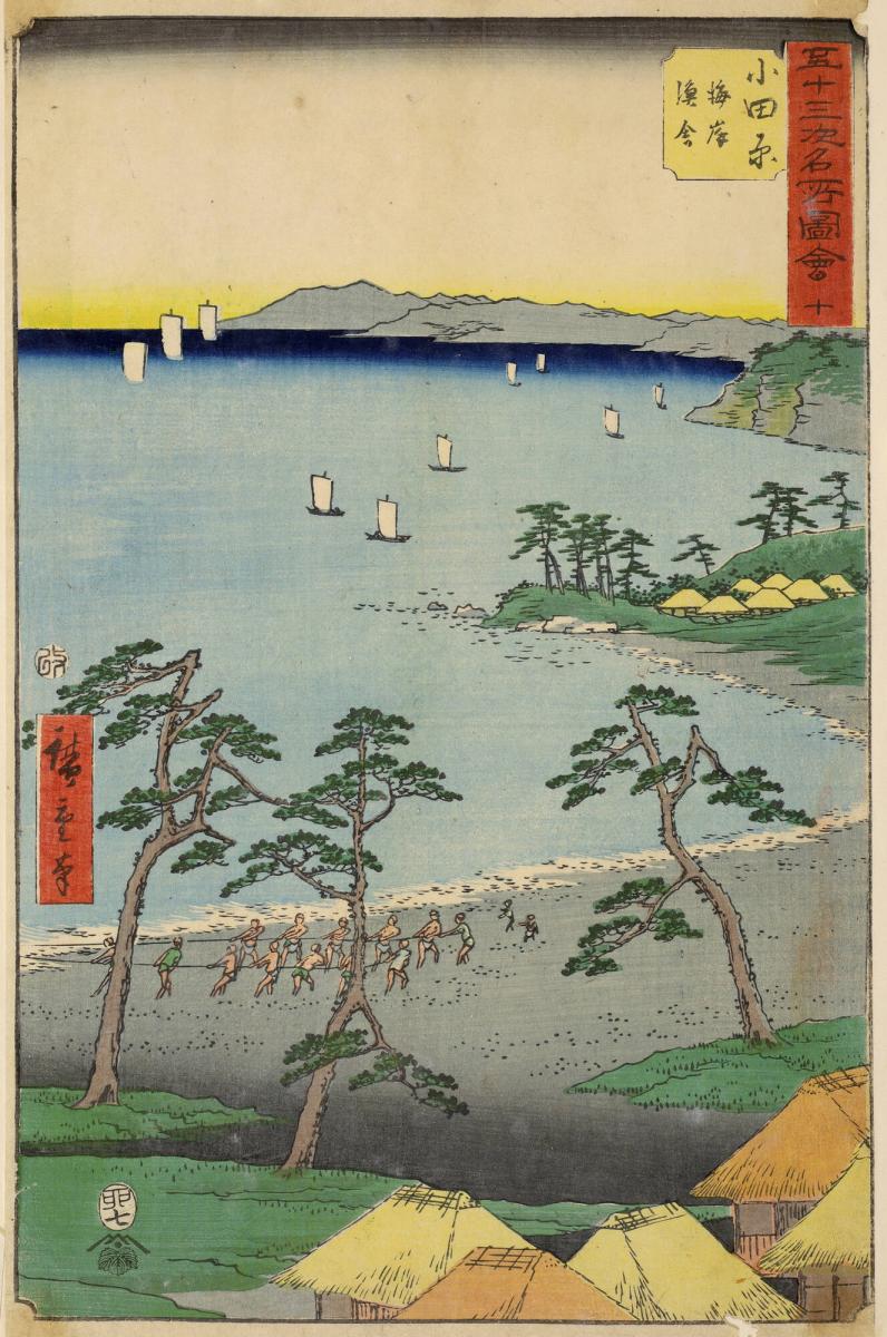 Fishermen on the Beach at Odawara, no. 10 from the series Pictures of Famous Places of the Fifty-three Stations, the Vertical Tōkaidō