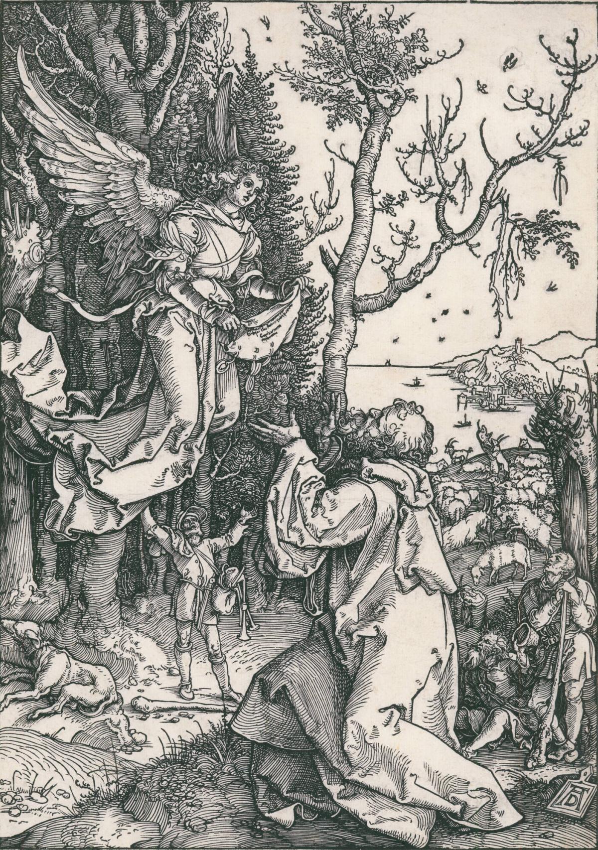 Not on viewThe subject of this print derives from Jacobus de Voragine's Golden Legend, a collection of stories of the lives of saints written in the thirteenth century. As told in this account, the angel Gabriel visits Joachim and reveals that Joachim's wife is pregnant with the child, Mary, who would one day give birth to the Savior. Dürer represents Gabriel's apparition to Joachim in a forested setting, accompanied by shepherds who look on at the scene in bemusement.