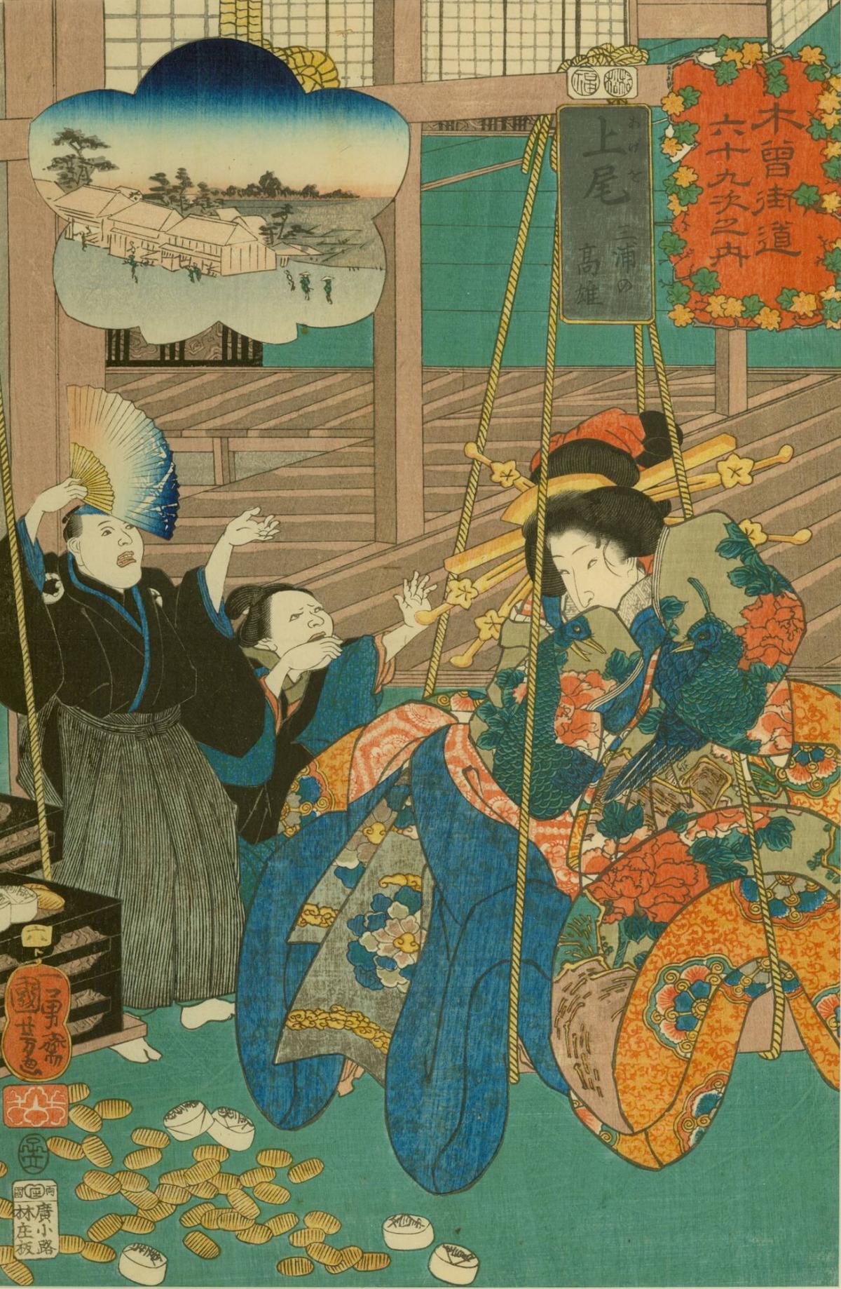 Ageo: The Courtesan Takao of the Miuraya house Being Ransomed for Her Weight in Gold, no. 6 from the series The Sixty-nine Stations of the Kisokaidō