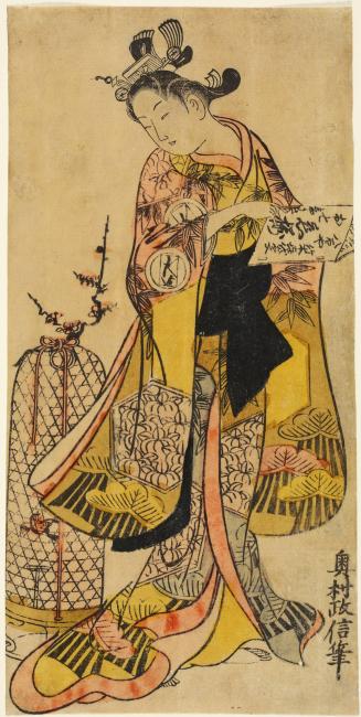 In an Edo version of cosplay (a contemporary Japanese pop-culture term for “dress up,” combining the words “costume” and “play”), the print shows a kabuki fan dressed as Oshichi, holding a copy of a recent play about her. The circle motif at her elbow shows a love letter; the caged bird symbolizes Oshichi’s plight; and the plum blossom (on the cage), pine, and bamboo (on her kimono), known as the Three Friends of Winter, symbolize the New Year’s prayer in which Oshichi accidently revealed her guilt.