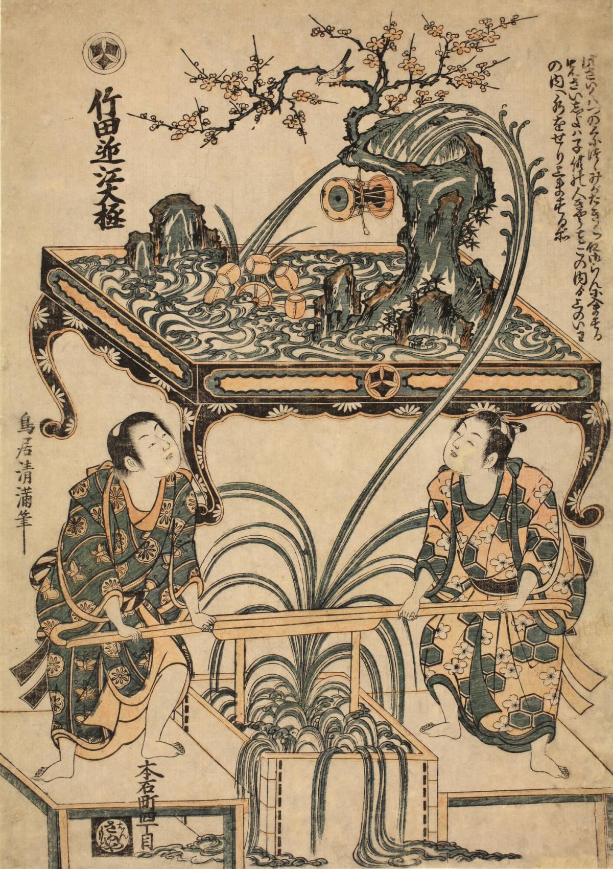 There are a few surviving prints by Torii Kiyomitsu of these spectacular devices. In this example, two mechanical boys vigorously pump water that shoots into a “tray landscape” meant to be understood as the high mountainous peaks of the legendary islands of the immortals in the Pacific. The water fills the hollow, tallest peak, then sprays out to turn a small waterwheel. The mechanism also caused the bird to sing and the drum to beat.