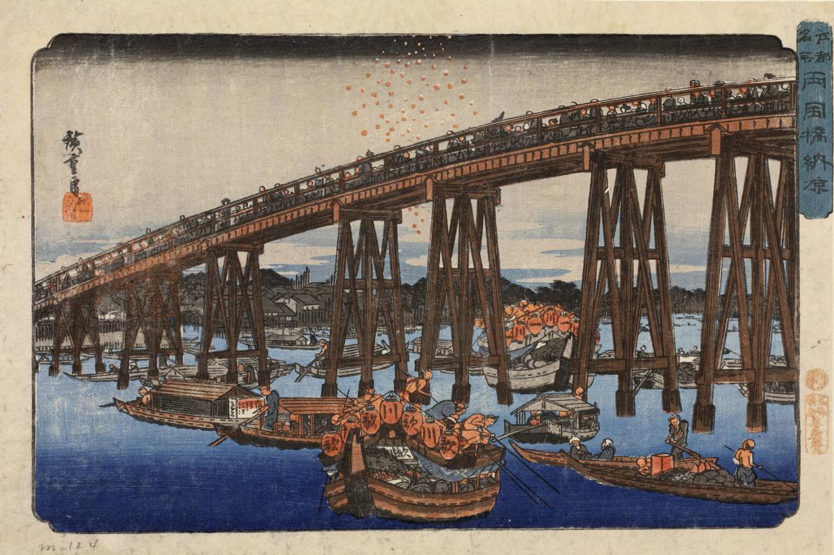 Fireworks on a Cool Summer Evening at Ryogoku Bridge, from the third series Famous Places in Edo