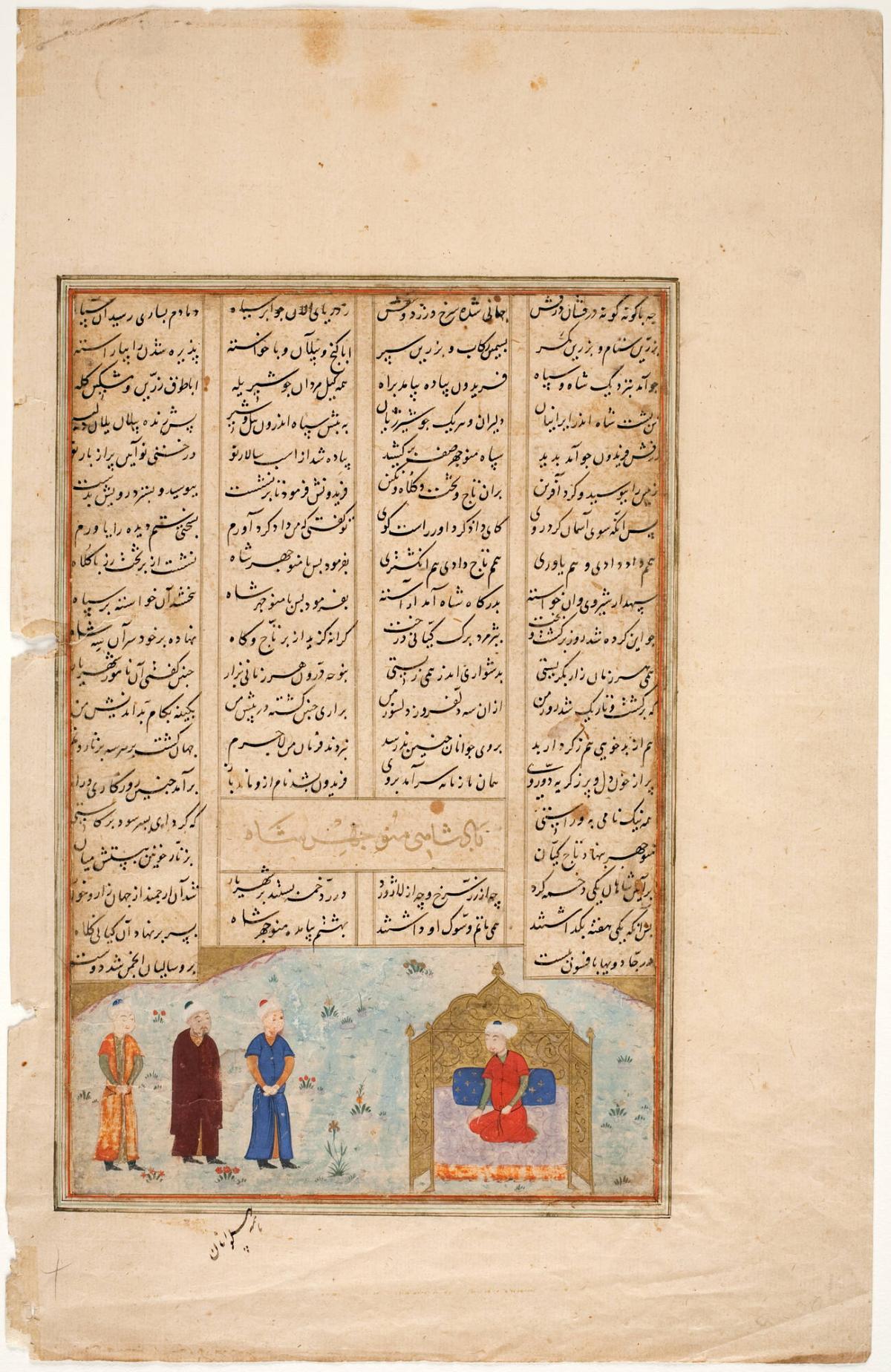 This folio depicts the story of the Persian king Manuchehr. With its emphasis on two-dimensionality, it follows a tradition that rejects any attempt to create life-like human figures that occupy a three-dimensional space.