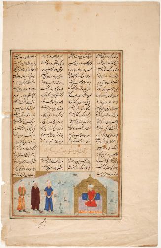 Not on viewThis folio, arguably one of the most precious pieces in the AMAM’s collection of Islamic art, depicts an episode from the Shahnameh (The Book of Kings), the national epic of Persia. The text was composed by Abu’l Qasim Ferdowsi (AD ca. 935-1020) in the late tenth and early eleventh centuries at the court of Mahmud of Ghazna, Turkish ruler of the northeastern province of the Muslim world.