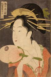 Not on viewThis is an image of Somenosuke, one of the highest-ranking oiran, or courtesans, of the Yoshiwara. Her rank is indicated by the combs and many hairpins she wears. Look carefully at the shimmering grey background. Glue and colorant were mixed and printed on the background, which was then sprinkled with finely ground mica in a technique called kirazuri 雲母摺 (mica printing). The mica, unfortunately, easily wore off over time. It would have been a dramatic effect when the print was first published. In fact, the technique was later banned by the authorities as “too luxurious” and bad for public morality.