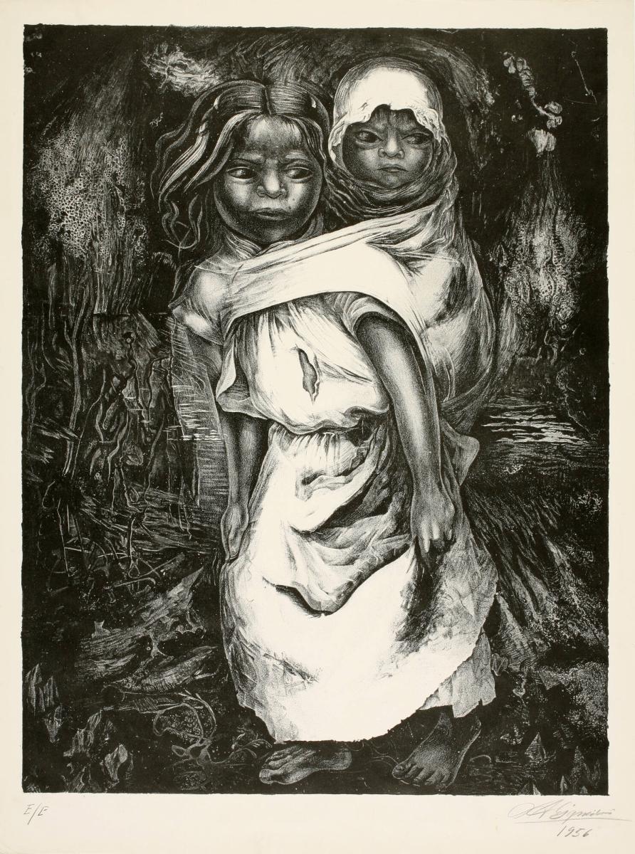 Not on viewSiqueiros' lithograph Child Mother, produced more than 20 years after most works in this exhibition, underscores his artistic longevity (Orozco died in 1949; Rivera in 1957). More than the other two "grandes," Siqueiros was forced to address the long-term changes in the direction of the Revolution. Forty years after the start of the Revolution, and despite the growing political and economic strength of the state, the lower classes seemed farther than ever from the rewards promised them. Siqueiros' lithograph suggests the strife and poverty to which peasants were still subject. The violent backdrop which frames the young mother and her child threatens to overcome them, yet their determination is echoed in their ferocious gazes.