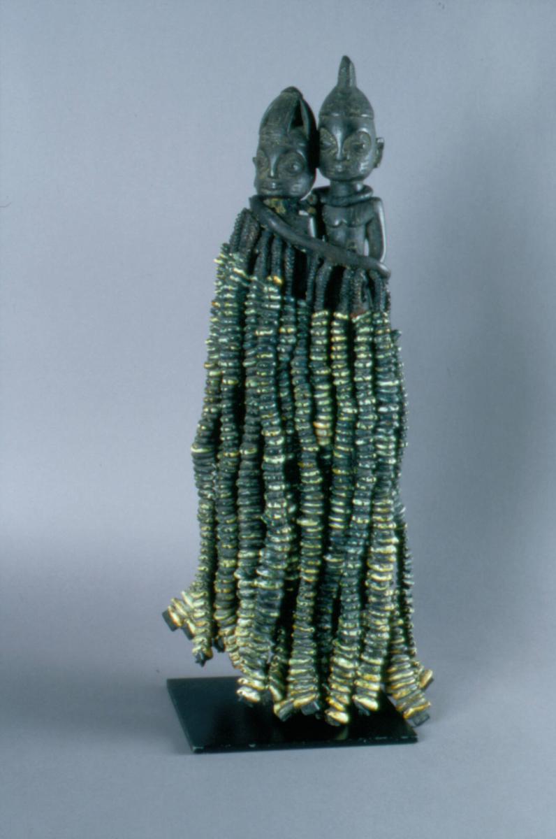 On viewDuring the festival procession each year, a devotee paraded with these wands to appease and honor Eshu, lord of crossroads, guardian of markets, and messenger between deities and humans. Held close to the body and waved back and forth, the wands performed the devotion of its owner. Strands of cowrie shells, a form of money, conveyed wealth and prestige on Eshu. The two figures here represent a unique aspect of the dance wands produced in Igbomina. They symbolize Eshu’s ability to bring contradictory forces into productive harmony.