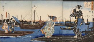 The real subject, though, is in the foreground: four young women, their dress identifying them as members of the urban townspeople (chōnin 町人) class of merchants and artisans. The prominence of the Sumiyoshi Shrine behind them suggests that they are returning from a visit there. Two are already on the shore, two more are on a ferry, about to arrive. Mitate is often subtle. Perhaps the “returning sails” theme refers not only to the ships in the background, but to the women themselves?
