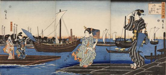 Tsukuda was a major fishing port in Edo located on a small island in the bay. In fact, at the right you can see three fishermen on a small boat, surrounded by larger ships laden with goods for the Edo markets. At the far left, the fluttering white flags on tall poles mark the location of the Sumiyoshi Shrine, a popular Shinto shrine on the island. The real subject, though, is in the foreground: four young women, their dress identifying them as members of the urban townspeople (chōnin 町人) class of merchants and artisans. The prominence of the Sumiyoshi Shrine behind them suggests that they are returning from a visit there. Two are already on the shore, two more are on a ferry, about to arrive. Mitate is often subtle. Perhaps the “returning sails” theme refers not only to the ships in the background, but to the women themselves?