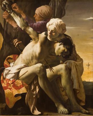 On viewThis work-one of the most important Northern Baroque paintings in the United States-is a strikingly sensitive vision of physical suffering. The third-century Saint Sebastian, shot with arrows by his fellow guardsmen for having converted to Christianity, was tended by the Roman widow Irene and her maidservant; none of the arrows had pierced a vital organ and they were able to bring him back to health. Here, left for dead, with his now gray, bloodless arm tied by a leather strap to a tree, he slumps forward as the women, fully absorbed in their work, tenderly begin to nurse him.