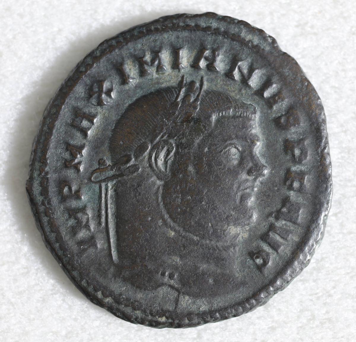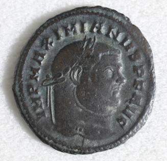 Follis: Obverse, Head of Maximianus; Reverse, Africa, Holding Standard and Tusk, Lion at Feet