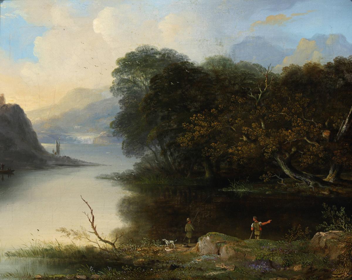 Landscape with Fishermen, Boatmen, Ruined Castle and Waterfall