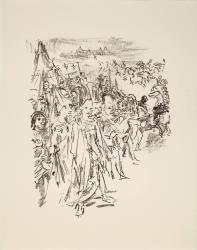Not on viewIn 1963, Austrian painter Oskar Kokoschka created a series of 16 lithographs to illustrate William Shakespeare’s King Lear. One of the Bard’s most highly-regarded tragedies, the play follows the elderly King Lear’s descent into madness after foolishly dividing his estate among two of his three daughters based on their false flattery, resulting in a tragic outcome for all. Kokoschka’s series depicts critical points in the narrative which often correspond to dialogue by Lear and his daughters Goneril, Regan, and Cordelia, in addition to that of the other characters vying for the throne. Providing minimal information about the setting of each scene, Kokoschka’s sketchy compositions instead focus on the characters, each depicted with the artist’s characteristic energetic expressionism.