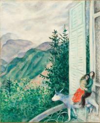 On viewKnown for his rich use of color and loose brushwork, Chagall painted dreamlike imagery lifted from his imagination. In the Mountain features softly-rendered figures that evoke a sense of loss and longing. Set against a lush backdrop of mountainous shadows and trees, the couple in In the Mountain is poised to float through the oversize, open window,