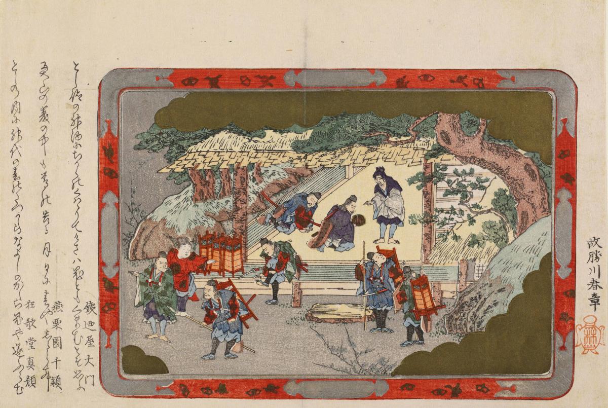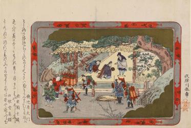 Raiko and His Retainers Disguise Themselves as Priests and Set Off for Oe Mountain, from the untitled series of four pictures after paintings by Shunsho