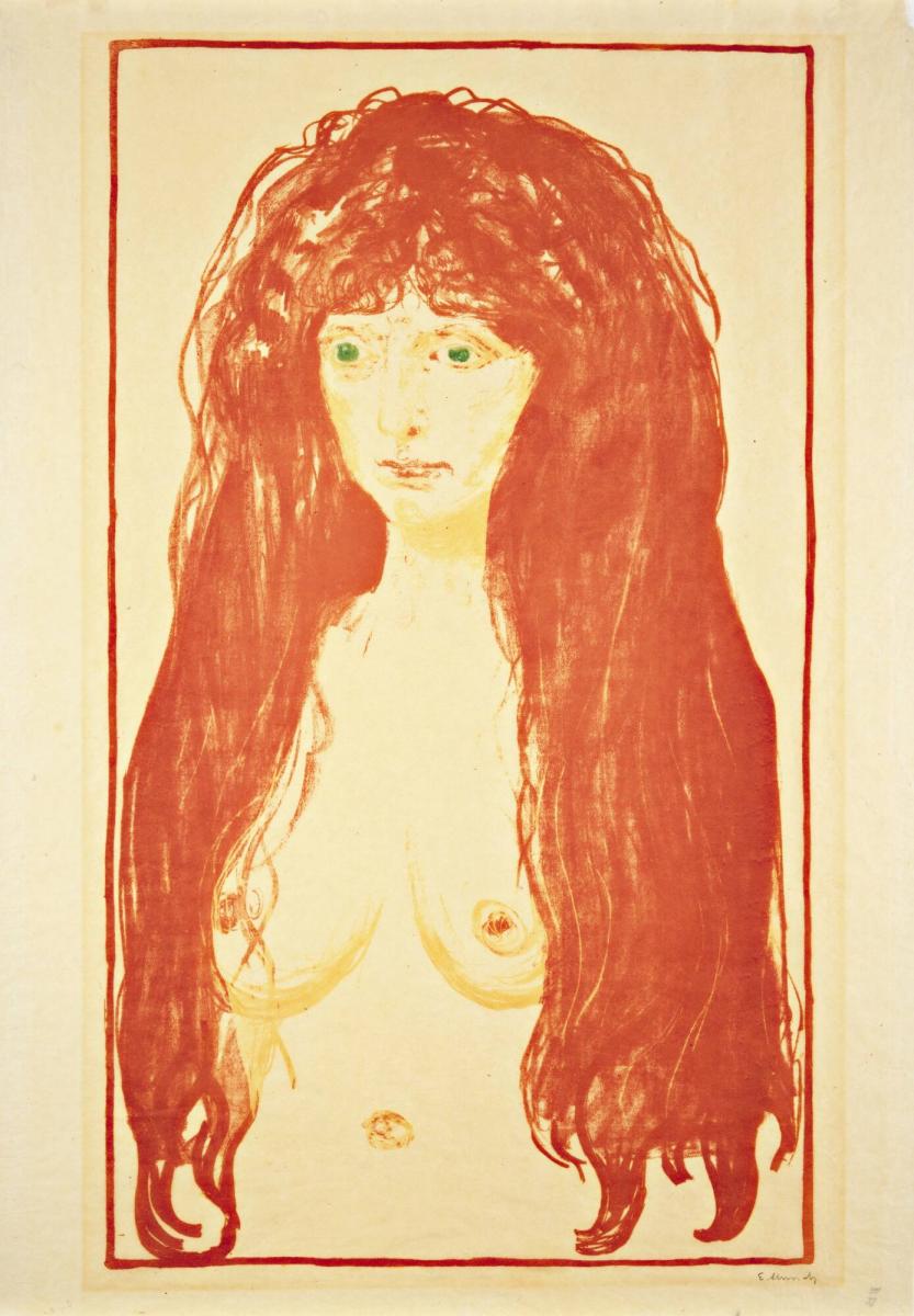 Not on viewOriginally thought to be a vengeful image of Munch’s ex-fiancée, Tulia Larsen, the woman in this image has been identified as a professional model who posed for the artist many times throughout his career. She is presented as a femme fatale, a popular trope in Romantic and Symbolist literature. Her long red hair and full breasts entice the gaze of the presumed male viewer. One wonders, though, what is the sin being depicted? Is she a re-imagining of Eve and original sin? Or perhaps she embodies one of the seven deadly sins, her eyes green with envy, or her naked body indicative of excessive lust.