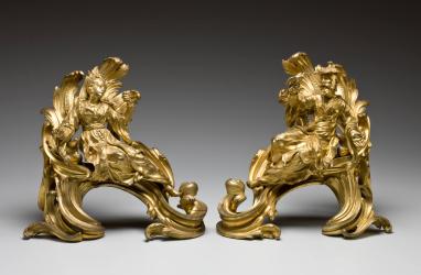 Ormolu Andirons in the Form of Male and Female Chinese Figures Seated on a Support of Rocaille Work