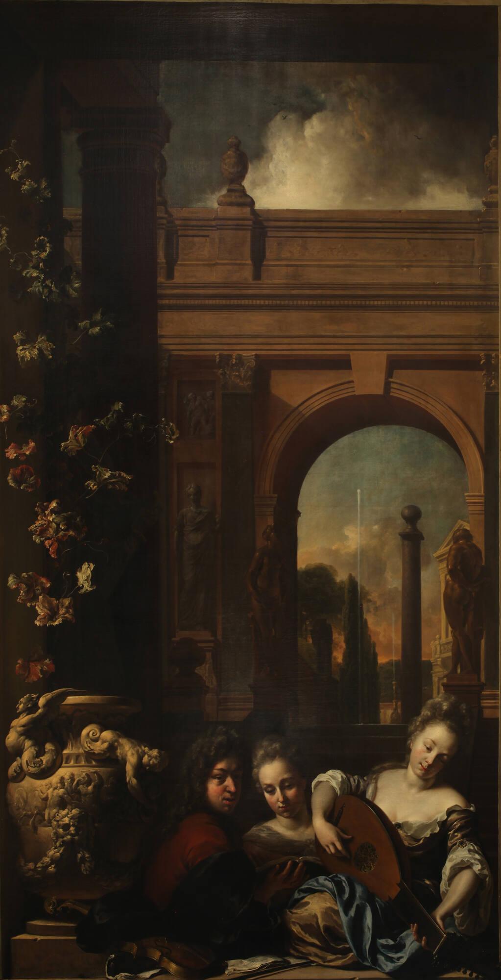 On viewOnce part of a set of five paintings by Weenix illustrating the five senses, this monumental canvas is an allegory of “hearing.” The nearly life-size musical trio—a lutist, violinist, and vocalist—is shown mid-performance. The violinist, however, has abandoned his instrument and turns his attention toward the viewer as if we have interrupted this intimate concert. In the background, the classicizing architecture blurs the boundaries between real and fictive space, a technique called quadrature (illusionistic perspectival rendering of architectural elements).