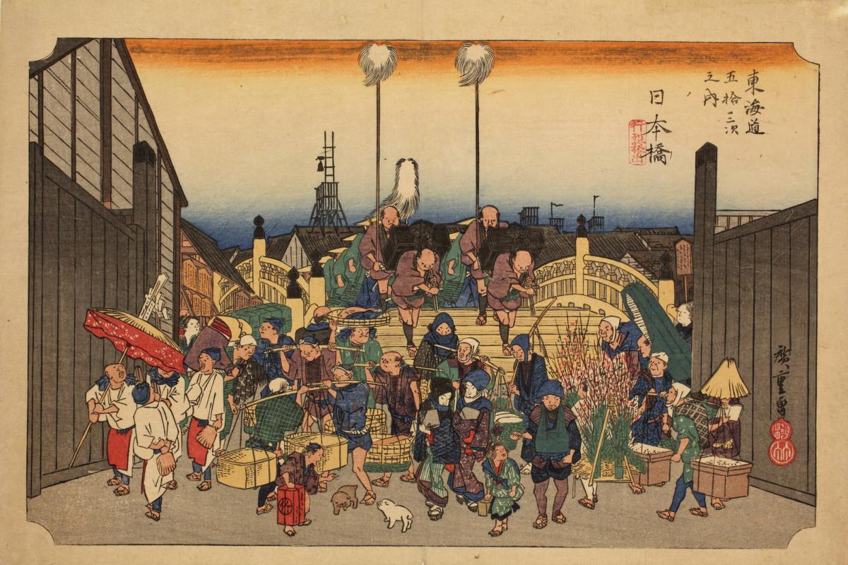 A Procession Sets Out at Nihon Bridge, no. 1 from the series Fifty-three Stations of the Tōkaidō
